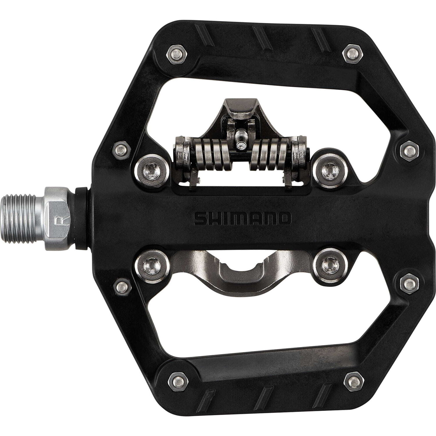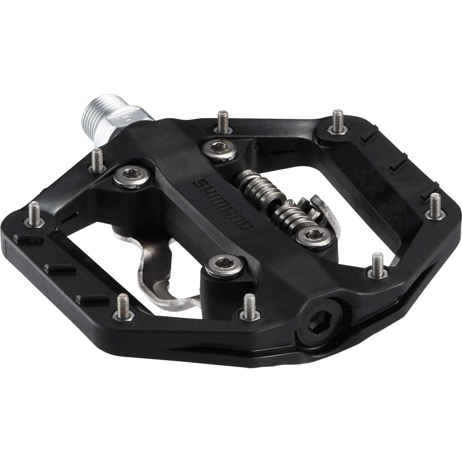 - ? Hybrid SPD and platform design- ? Wide (111 mm x 96 mm) platform for improved pedaling stability- ? Eight pins per side for enhanced grip and bike control- ? Resin pedal body with textured finish for improved durability- ? Thinner pedal profile for increased ground clearance- ? Durable bushing bearing construction for long-lasting performance.- ? Best Paired with SHIMANO GF, EX, and ET shoes