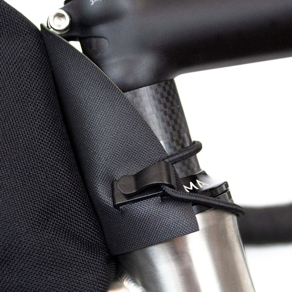 The headset fitting is designed to work with all headsets including bikes with a low stack height. Whilst the sturdy plastic base has reinforced holes to allow it to fix onto the top tube bolt bosses eliminating the need for straps and keeping the bag secure.