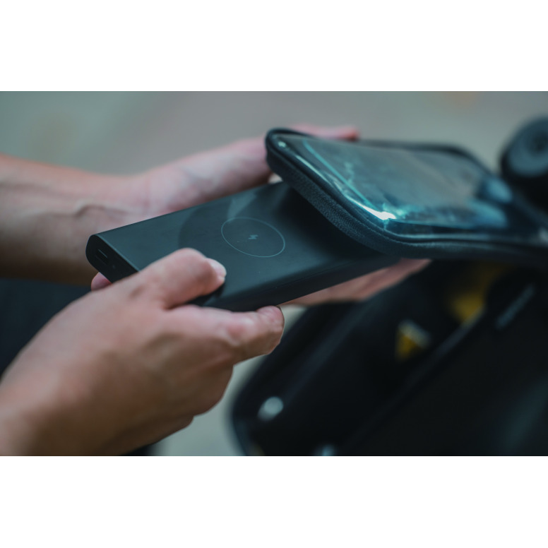 A top tube bag and phone case 2-in-1 design, featuring a transparent protective film that allows you to operate your phone while it's inside the bag. The second compartment of the bag features dividers that allow you to easily organize and store small items such as credit cards, loose change, keys, and other personal belongings.