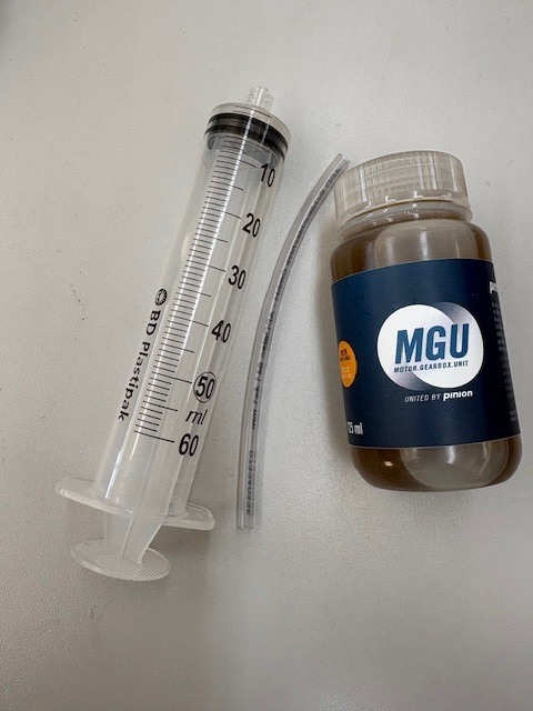 For optimum care and maintenance of your eBike with Pinion MGU, you should change the oil every 10,000 kilometres. With this service kit, you can easily change the oil yourself. Open the two oil screws on your MGU, drain the old oil and close the drain plug. Use the enclosed syringe to press in the new MGU oil. Use the entire quantity of oil supplied and close the inlet screw. You are now ready for the next 10,000 kilometres.